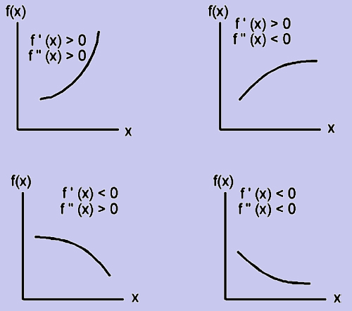 The following figures and table show various combinations of signs of f'x and f''x and the implied slope of the graph of f(x).