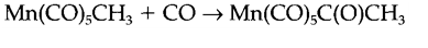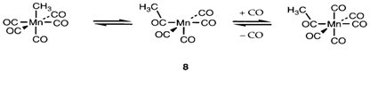 in which a Mn-CH3 bond is changed by Mn-C(O)-CH3. The terminology is misleading as it is published by isotopic labeling that the incoming CO is not the one inserted. The first step is a opposite alkyl migration leading to a 16- electron intermediate which then picks up another CO molecule as show in 8.