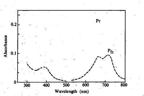 Figure: Absorption spectrum of phytochrome in vitro. Phytochrome was purified add its Absorption spectrum was measured by a spectrophotometer. When Pr was irradiated with red light, the absorption spectrum (dotted line) was obtained. This shows the conversion of Pr to Pfr.