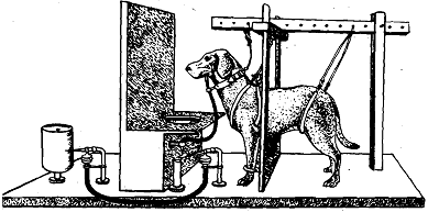 apparatus devised by the Russ~an scientist to test learned reflexes. Saliva canied by a tube to beaker, acttvated a lever connwted to the pen beyond the screen at left. Each dmp of saliva was registered by a mark on the revotvtng drum. The dogs evidently learned to enjoy their work, hopping up onto the platform without being asked. This, of coutse, is a natural response of any dog. He begins to salivate when he gets his food. But a strange thing happened. The dog began to salivate at the sight of the apparatus or the experimenter even before the food was placed in front of it. Pavlov could have treated this as an experimental nuisance but being a scientist he started asking questions. Pavlov knew that salivation at the sight of food was a natural reflex action. It happens in every dog since birth, but the other reaction was something new, what we can call a learned reflex. Now he decided to investigate if the dog could be made to associate food .with other stimuli. In a typical experiment, a bell was sounded just before the meat was given to the dog. This was repeated several times. Pavlov noticed that the dog now began to salivate as soon as the bell was rung even if food was not given. The animal associated the two stimuli, food and bell, therefore, one could be substituted for the other. Table shows the steps in this training process.