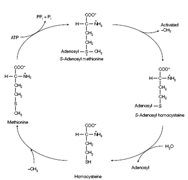 S-Adenosyl methionine serve as a donor of methyl sets in numerous biological reactions instance for in the formation of creatine phosphate and in the synthesis of nucleic acids. It is formed by the action of the activated methyl cycle. In during donation of its methyl group to another compound, S-adenosyl methionine is altered into S-adenosyl homocysteine. To reproduce S-adenosyl methionine, the adenosyl group is deleted from the S- adenosyl homocysteine to form homocysteine. This is then methylated by the enzyme homocysteine methyltransferase, only two vitamin B12- holding enzymes found in eukaryotes, to form methionine. The concluded methionine is then activated to S-adenosyl methionine with the release of all three of the phosphates from ATP.