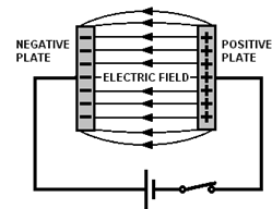 If we have two metal plates close together, but separated by an insulator or dielectric (which could be air) and we apply a voltage across them, electrons are removed from one plate and applied to the other and each becomes charged. The charge held by the combination may be very large because of the concentration of the electric field between the plates. This represents a basic capacitor.