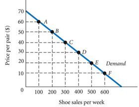 A sporting goods store has estimated the demand curve for a popular brand of running shoes as a function of price. Use the diagram to answer the questions that follow.