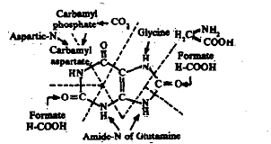 The synthesis of uric acid from ammonia in these animals occurs by the inosinic acid pathway. This pathway was first elucidated by Buchanan and his co- workers in the 1950s in pigeon liver. Uric acid is a member of the purines. While the details of the pathway are beyond the scope of this unit, in Figure the different fragments from which the uric acid molecule is assembled is shown. The dashed lines which divide the uric acid molecule in the Figure indicate the building blocks from which its biosynthesis takes place.