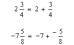 The meaning of this notation is that the whole number and the fractional part are added together. (Keep in mind that the negative sign, if there is one, is shared by the whole part and fractional part!) So, another way of writing our two mixed numbers would be:
