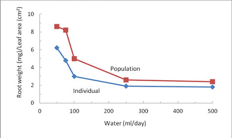 2. Competition for water between individuals of a population causes more root growth compared to individuals who are growing alone.